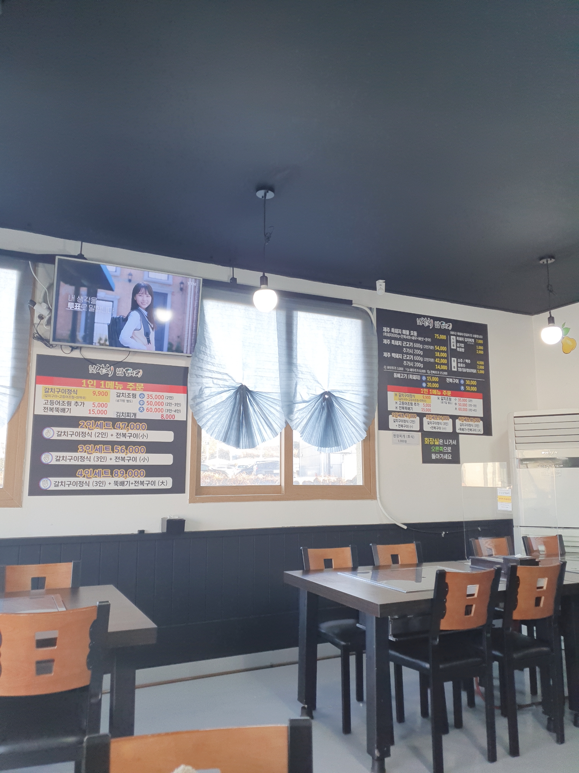 위치는 애월읍인데, 도로변쪽에 있고, 주변에 딱히 뭐가 있진않아요. 이동 동선중에 있다면 좋을 것 같고 특이한 점은 갈치정식 메뉴들과 제주흑돼지를 같이 판매하십니다.