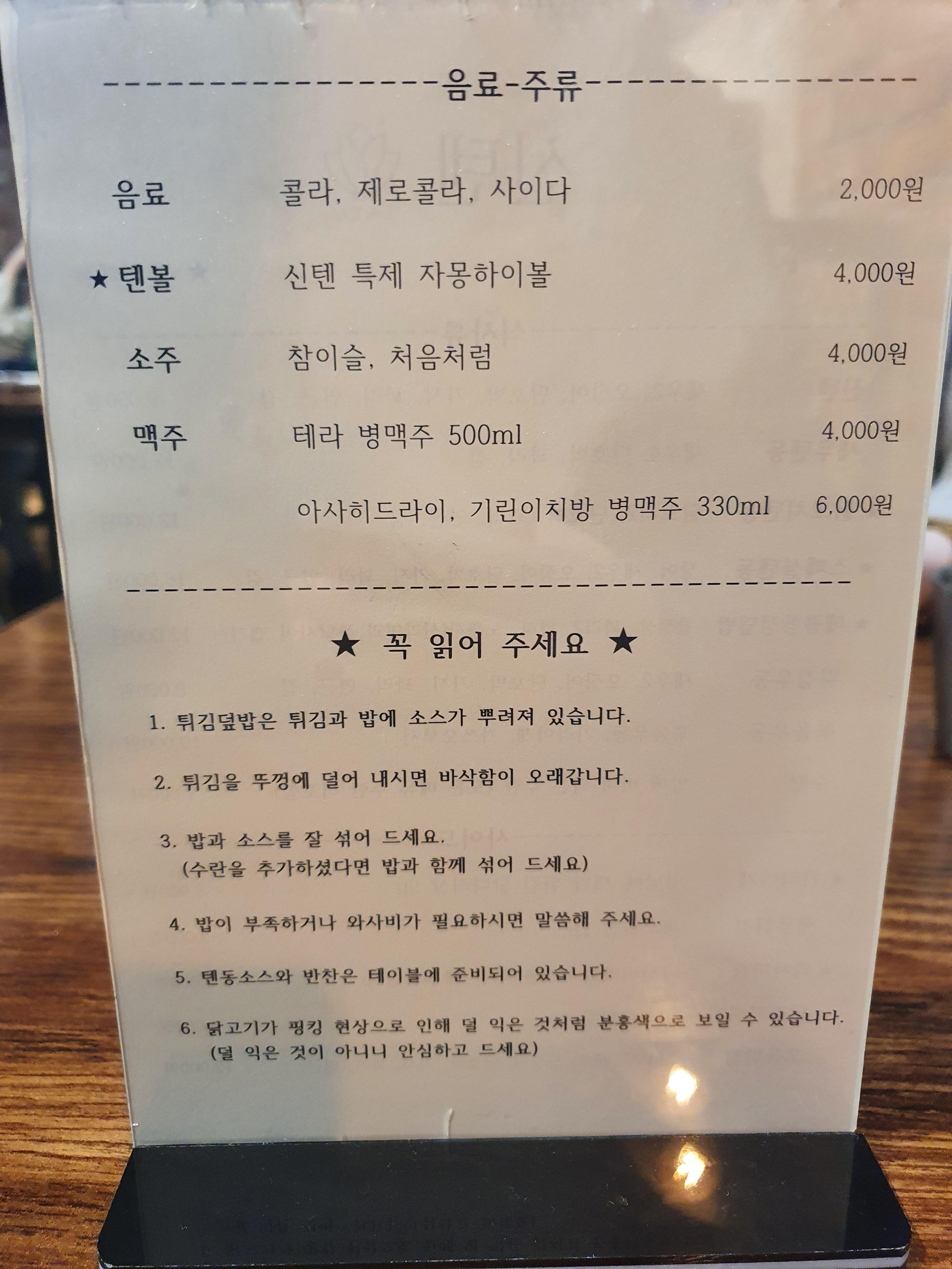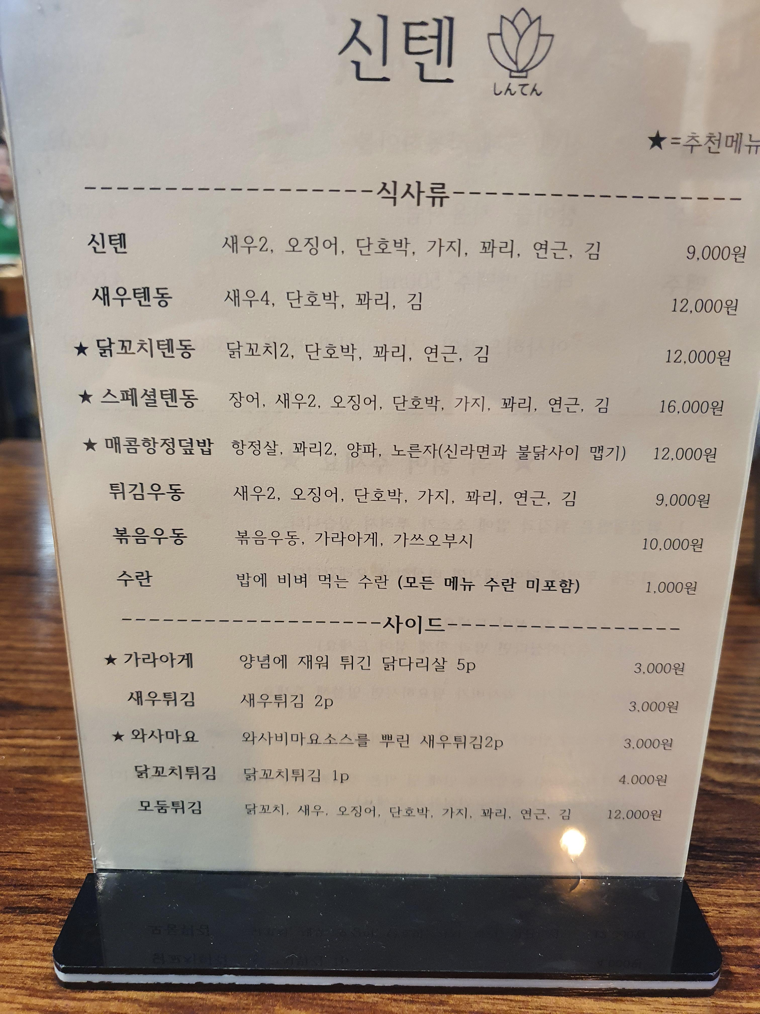 신텐, 새우텐동, 닭꼬치 텐동, 스페셜텐동, 매콤항정덮밥, 튀김우동, 볶음우동이 주 메뉴이고, 수란을 추가가능합니다.
