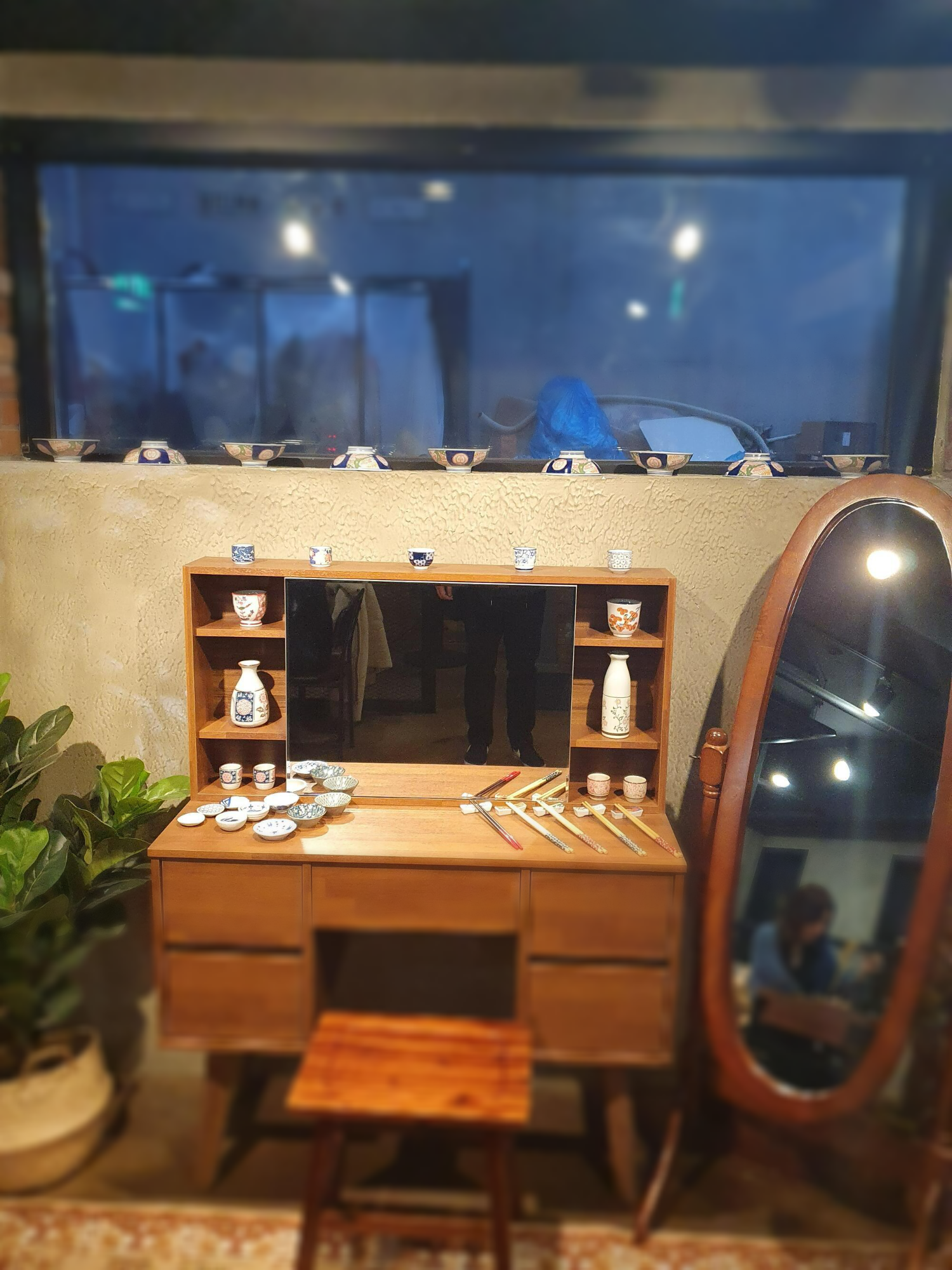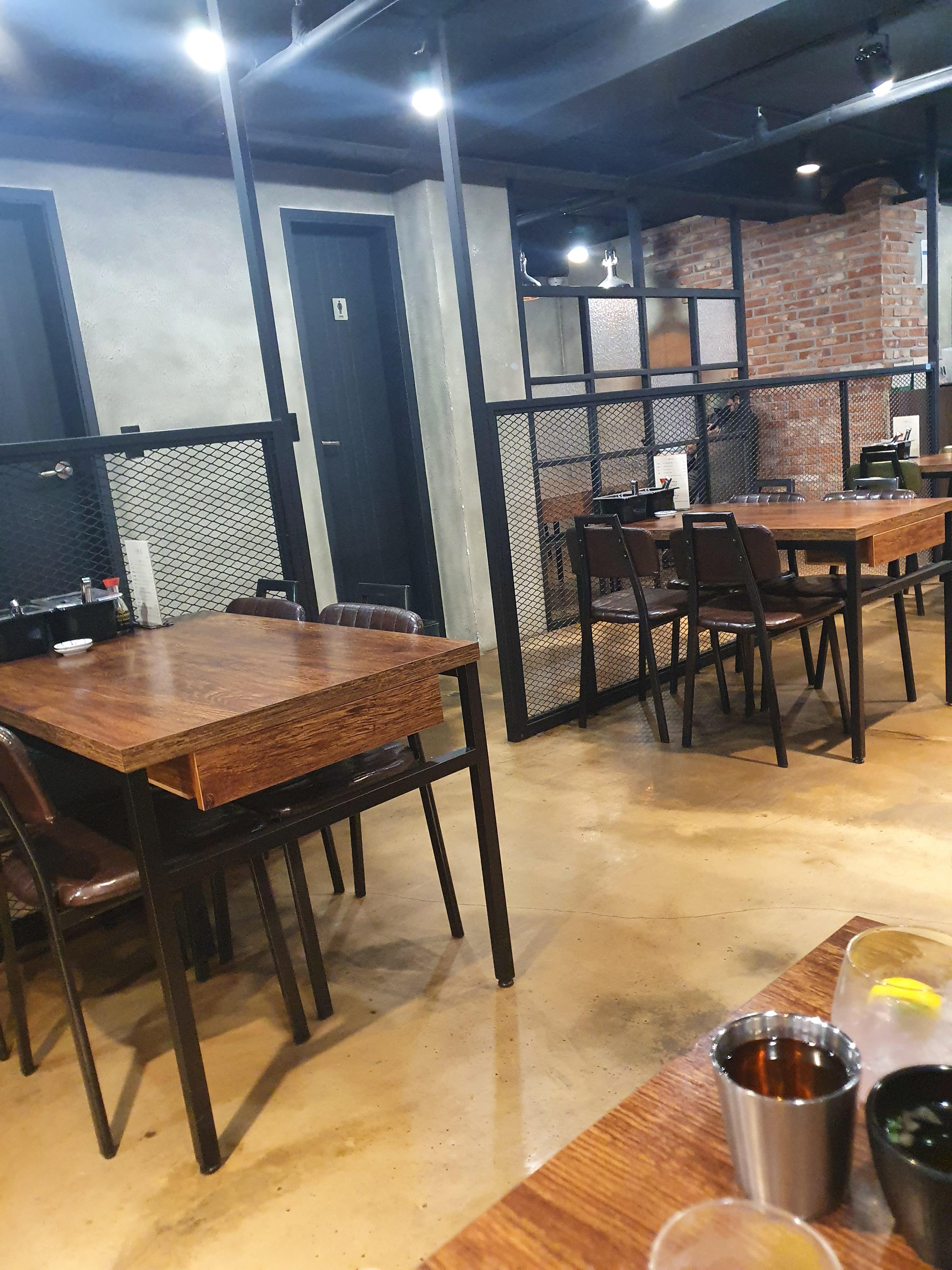 매장 자체는 매우 깔끔 하고, 반지층인데, 창이 벽쪽에 있어서 은근한 분위가 있습니다. 매장 입구쪽에는 일본식 잔과 그릇, 수저들이 장식되어 있는데 아주 깔끔한 느낌이 느껴지네요.