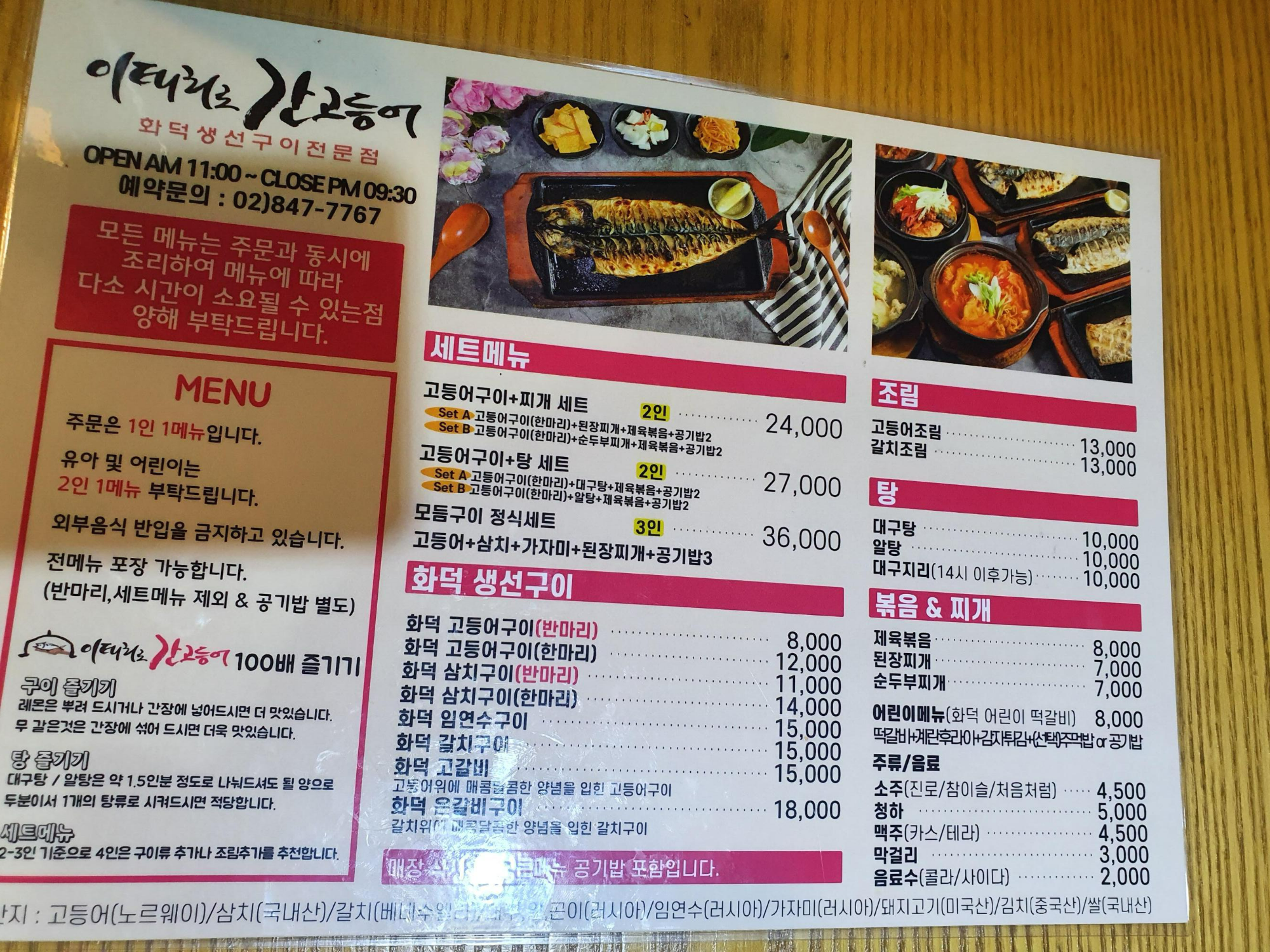 이태리로간 고등어 메뉴판 입니다.