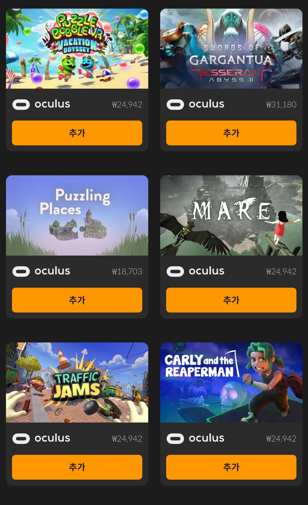3개 6개 9개 번들로 게임을 직접 선택해서 구매하시면되고 구매후 게임키를 받아서 오큘러스에 키를입력하면 오큘러스 스토어에서 구매한 것처럼 생성됩니다.
