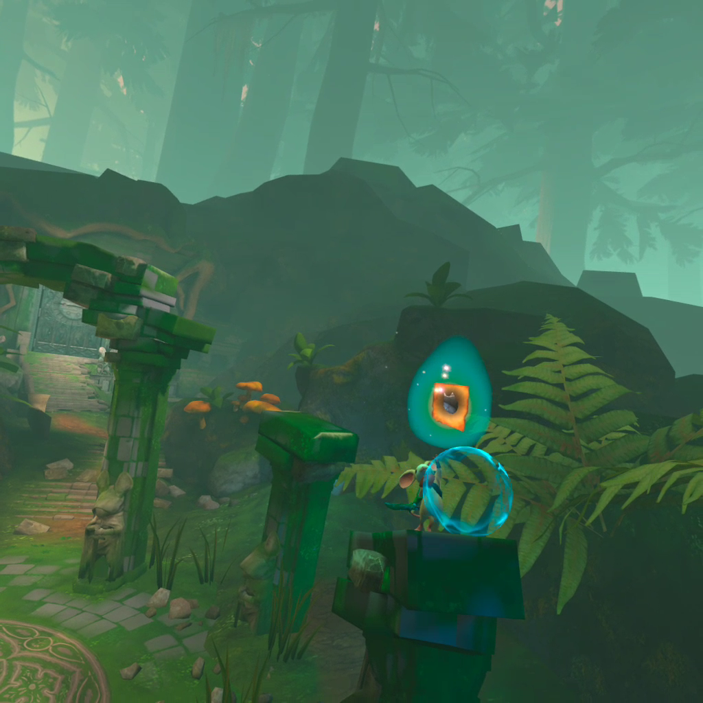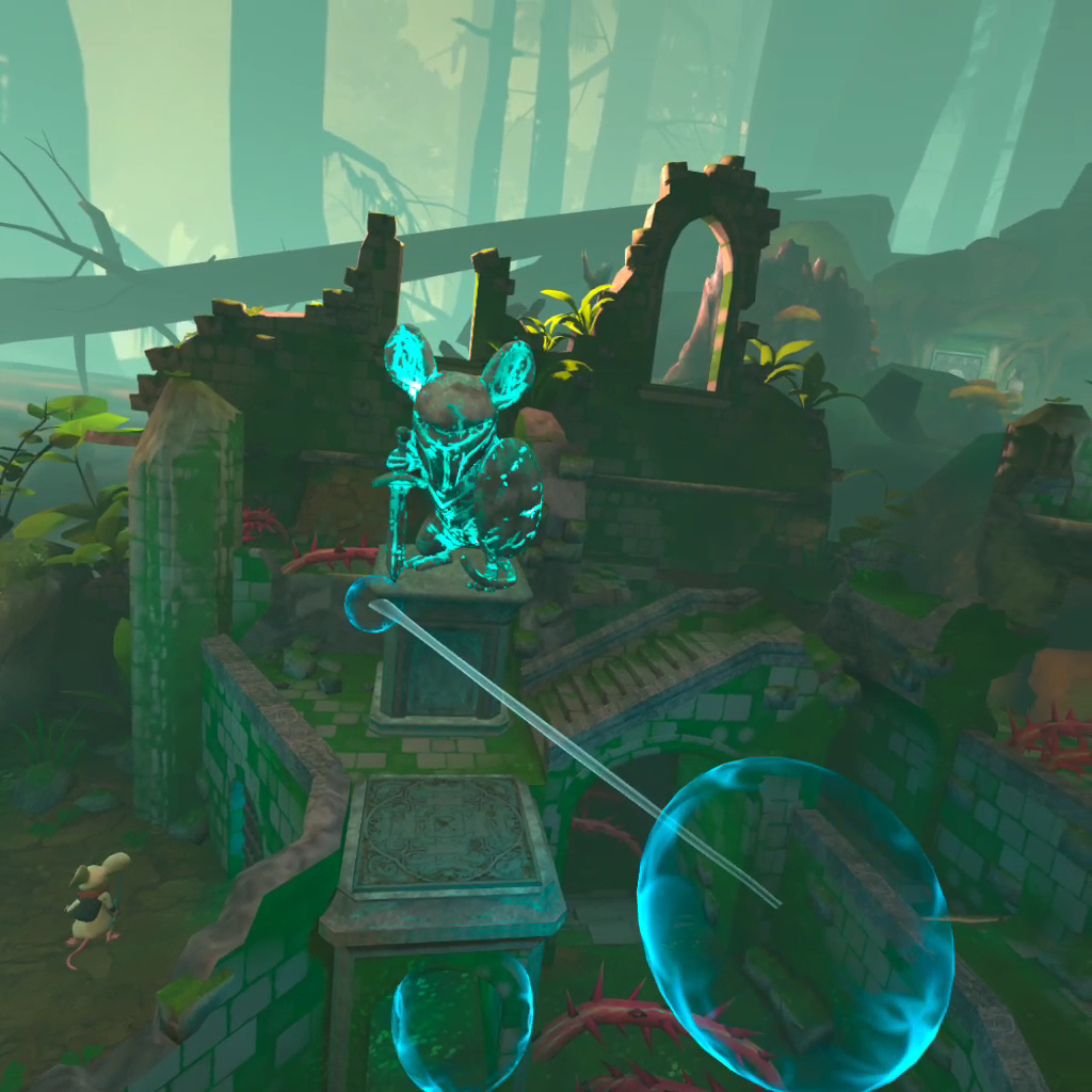 Moss는 일반적인 VR게임과는 다르게 3D공간에서 퀼을 지켜보면서 퀼을 조정하고, 도와주는 신적인 존재로써 게임이 진행됩니다. 직접 움직이는 방식이 아닌, 퀼을 통해서 게임을 조종하니 옛날 오락실 게임 같은 느낌도 살짝 있습니다.