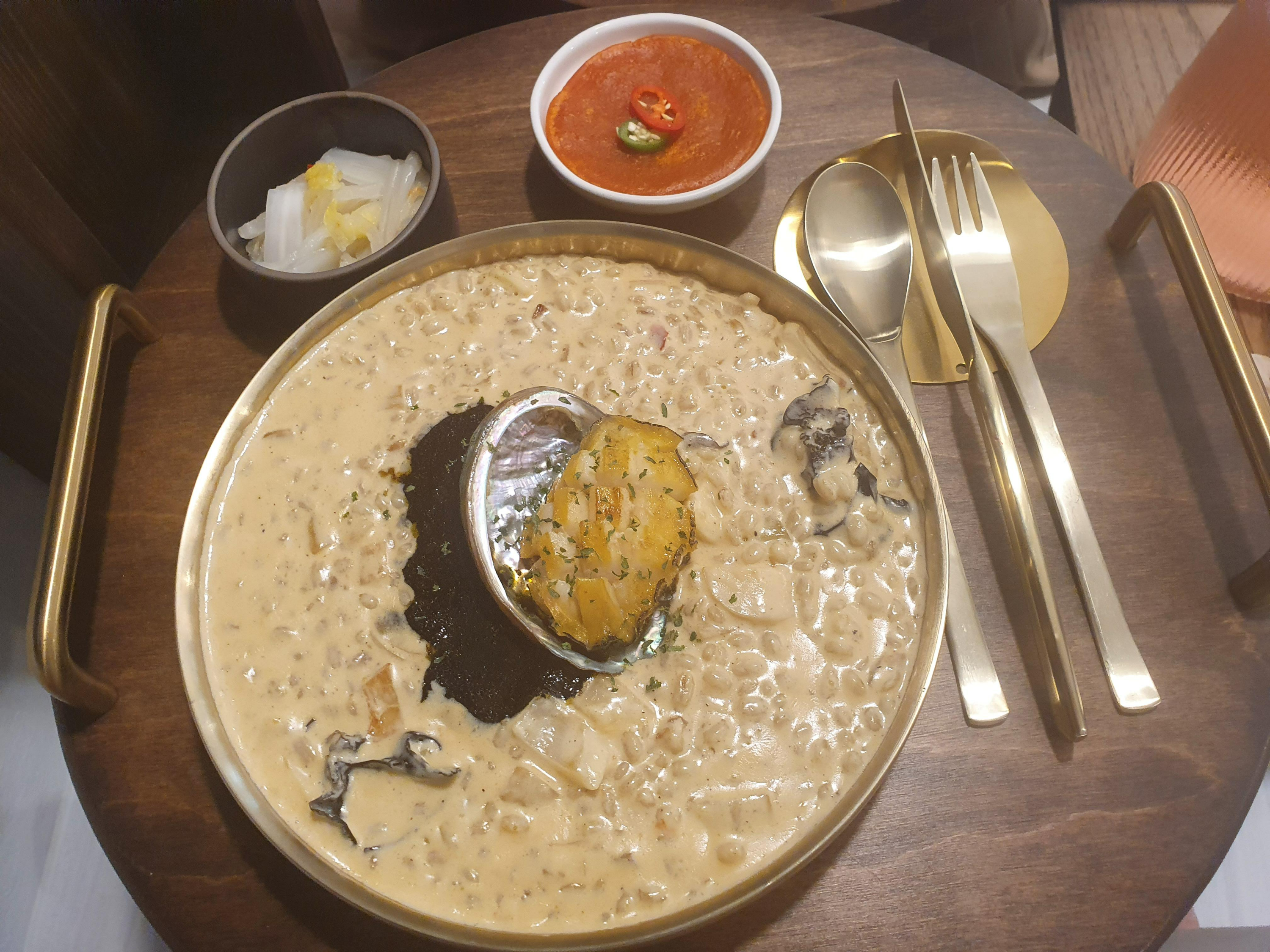김 전복 크림 리조또 기대감에 주문한 김 전복 크림 리조또 ! 김, 전복, 크림 아주 정직한 네이밍입니다. 리조또 인데 보리밥으로 되어져있고 크림 리조또 입니다! 가운데 전복이 있고 검은색 김한장이 있는 줄 알았는데 김페스토라고 합니다! 처음에는 김페스토없이 먹어보고 김페스토와 같이 먹어보고 전복도 같이 먹어보고 먹을 때마다 새로운 맛이 느껴졌어요.