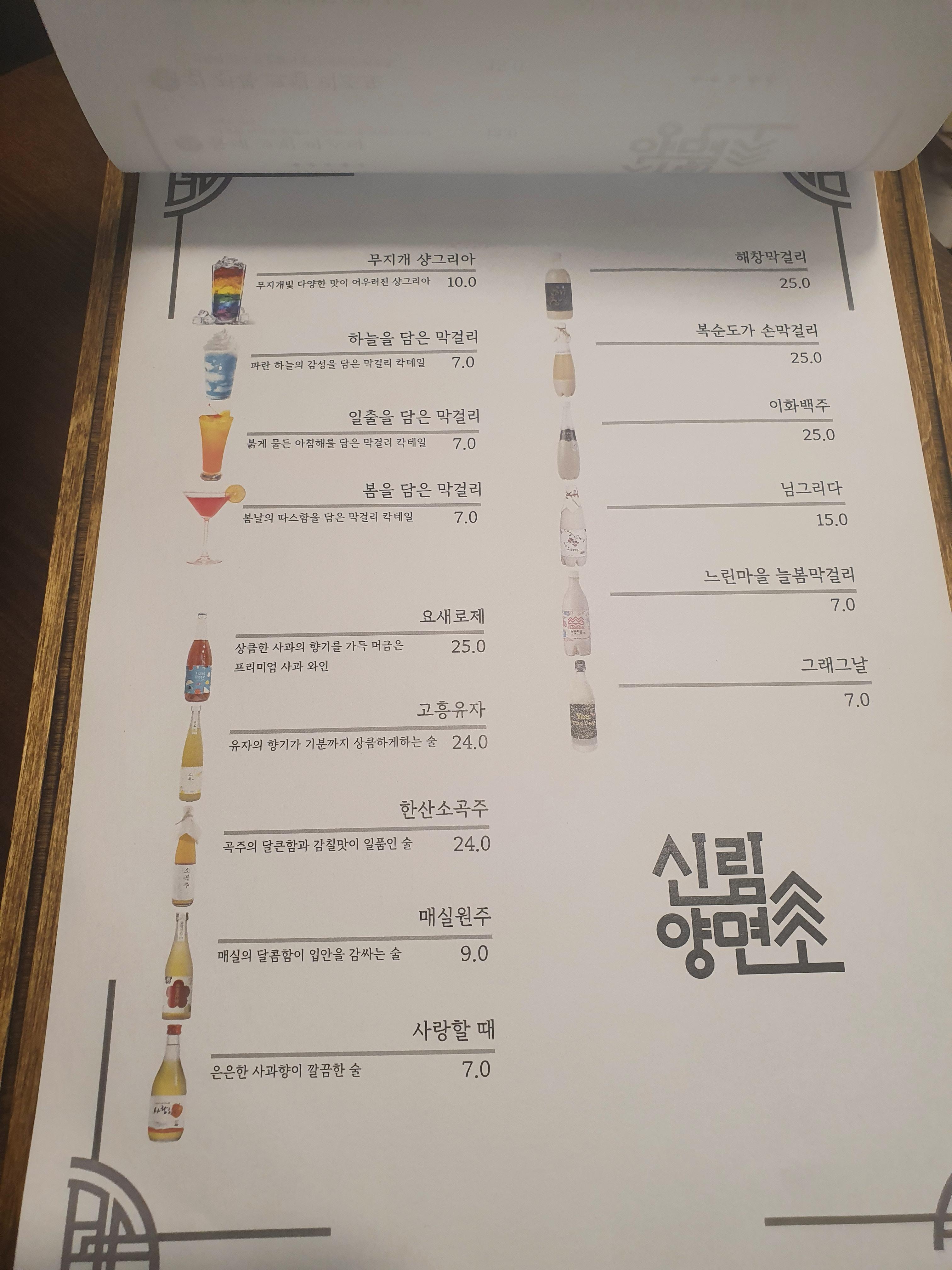 방문해보고 싶었던 이유 중 가능 큰 이유는 메뉴였습니다. 양식 베이스 한식 퓨전 음식점에 걸맞게 익숙한 이름 + 낯선 이름의 조합들의 메뉴 느낌?! 그리고 주류 또한 막걸리 칵테일, 막걸리 등이 다양하게 되어 있어서 신나는 고민의 연속입니다.