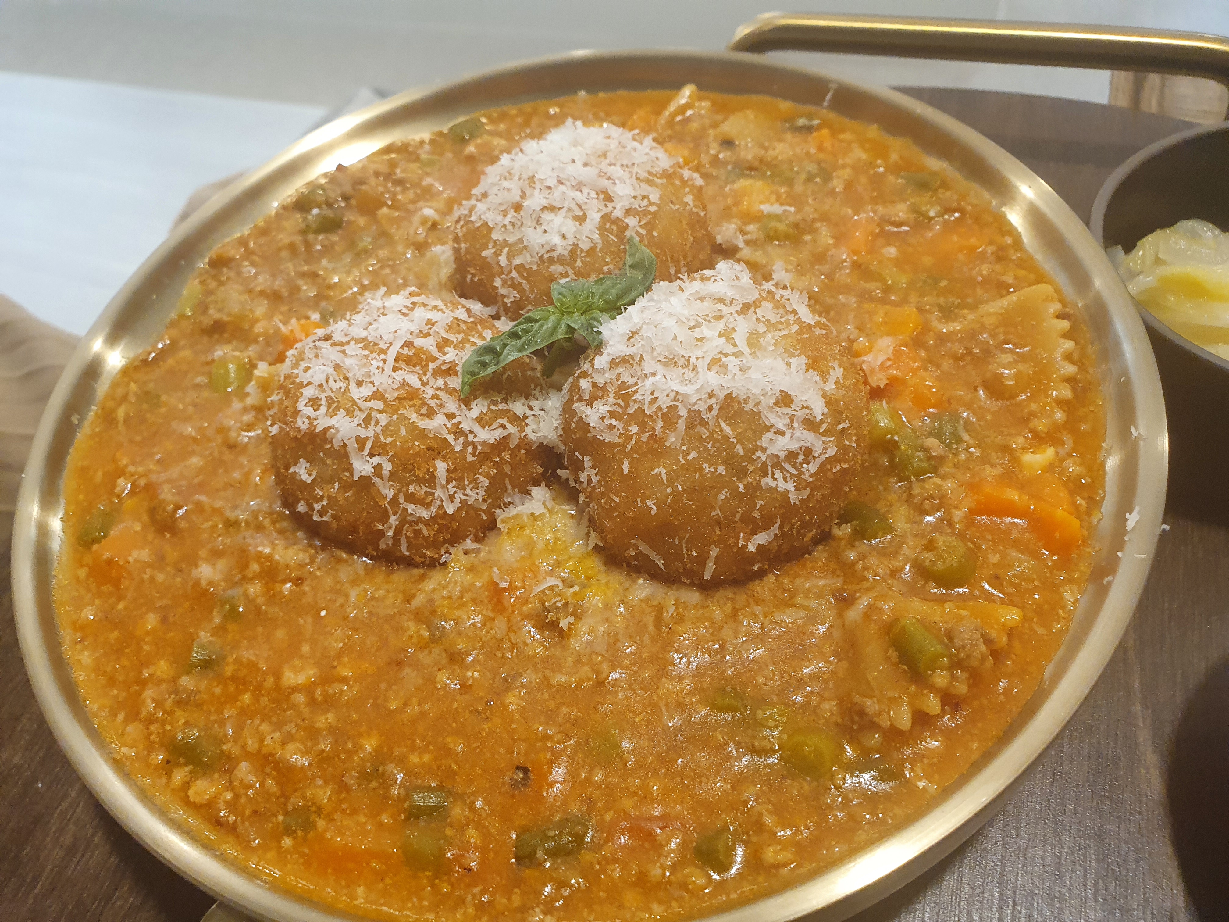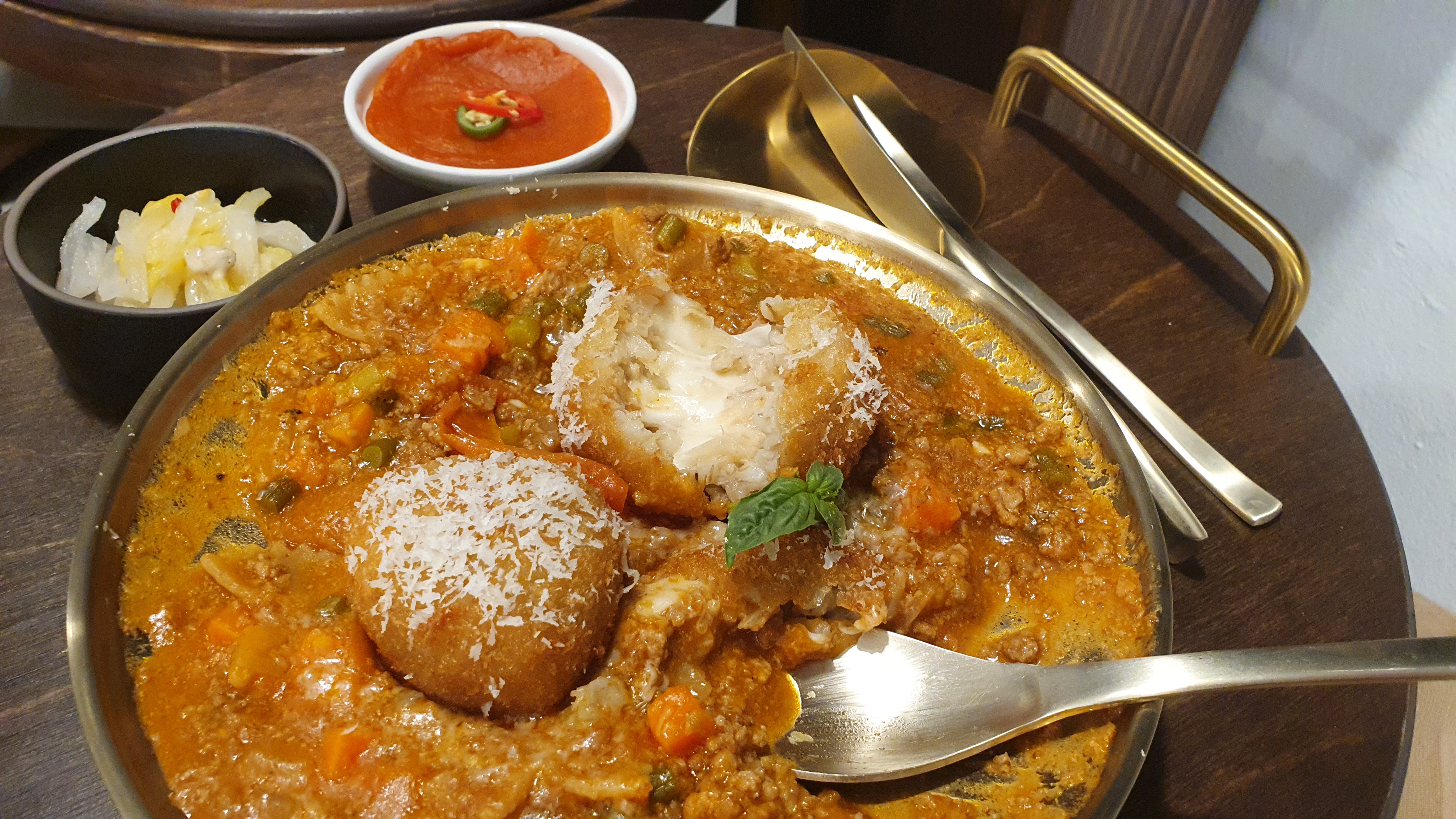 라구소스 묵은지 아란치니 라구소스는 미트소스로써 소고기 간것 과 토마토 베이스로 일반 적인 파스타 소스로 많이 쓰인다는 것 같아요. 아란치니는 라이스 볼이라고 생각하시면 됩니다. 즉 미트소스 라이스볼?! 볼안에는 밥과 치즈가 같이 들어있었어요. 소스는 평범한 토마토 소스느낌이라고 생각이 들었는데 라이스볼은 그냥 치즈만 먹는데도 맛있었어요.!