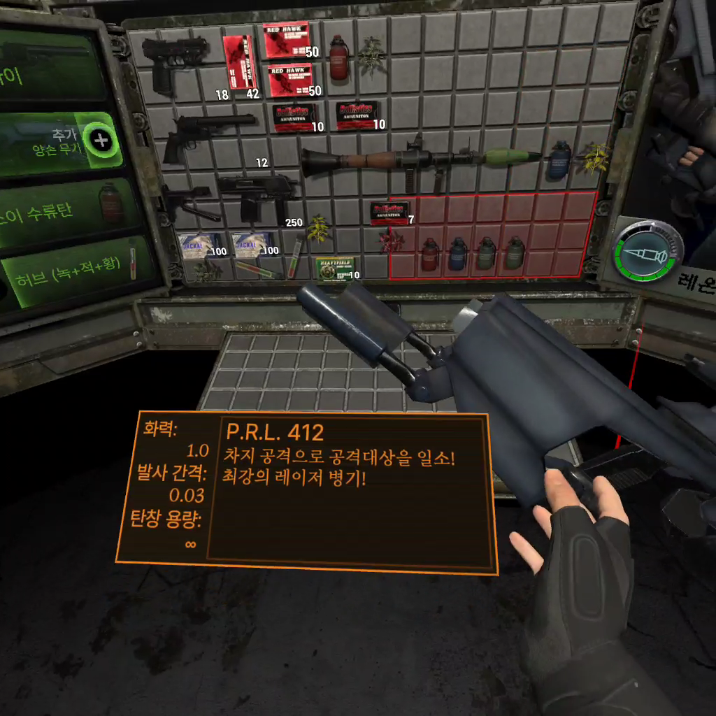 그리고 3번째 플레이는 전문가 모드로 한번더 했습니다. 레지던트이블에는 특전이라는 개념이 있습니다. 보통모드를 클리어하고서는 주인공 캐릭터의 의상을 받아서 의상을 바꿀 수 있고, 무한 로켓런처를 구매 할 수 있게됩니다만 100만원으로 바로 구매는 힘듭니다.전문가모드를 클리어하면 P.R.L 412라는 총을 줘서 다시 플레이할 때 시작부터 가지고 할 수 있습니다. 그런데 이 총이 너무 사기적인 총이었네요. 모든적이 1방.. 보스도 최대 2방입니다. 이걸로 두번째 전문가 모드를 플레이하면서 100만원을 모아 런처까지 구매하였는데, 이총이 더 효율이 좋습니다. 이밖에도 다양한 총들이 있고, 개조를 통한 업그레이드도 가능해서 여러가지 즐기실 수 있습니다.