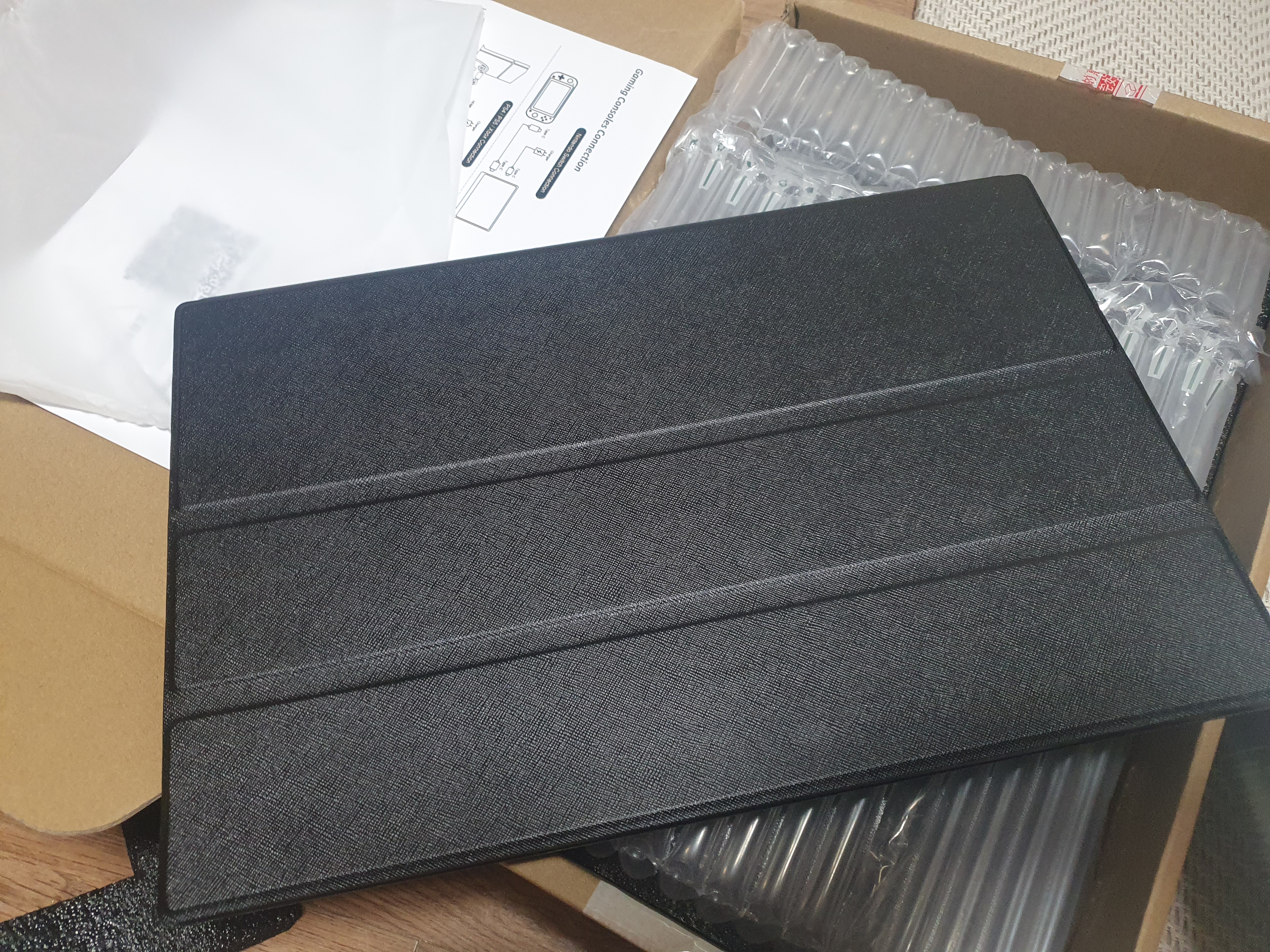 구성품은 C to C케이블 2개, 휴대용 스탠딩 커버, HDMI to HDMI Mini 케이블, 충전어댑터가 있습니다. C타입으로 충전하면서 사용 가능하고, 충전없이 연결시 연결된 기기에 전력을 사용하게 됩니다. 그런데 전력이 약하면 화면 출력이 문제가 있을 수 있습니다. 또한 C타입 연결과 HDMI 연결에 따라 출력 해상도 빈도가 120~144 까지 나오는 것으로 확인 됩니다.