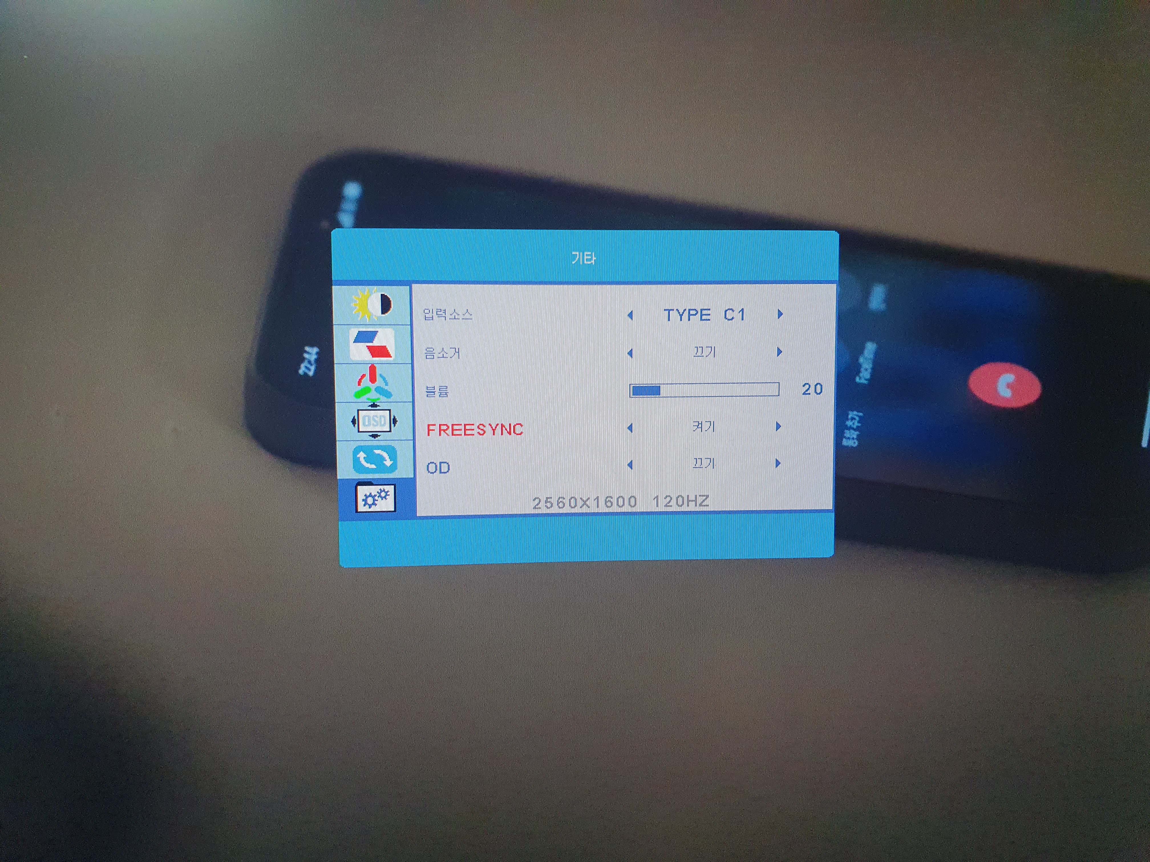 모니터 좌측에 전원 버튼, OSD 설정 버튼과 볼륨조절 스위치가 있는데 볼륨 스위치를 아래먼저 내렷다가 설정하면 볼륨, 위로 한번하면 밝기조절이 됩니다. OSD설정은 일반 모니터와 거의 같고, 프리싱크, HDR까지 지원합니다.