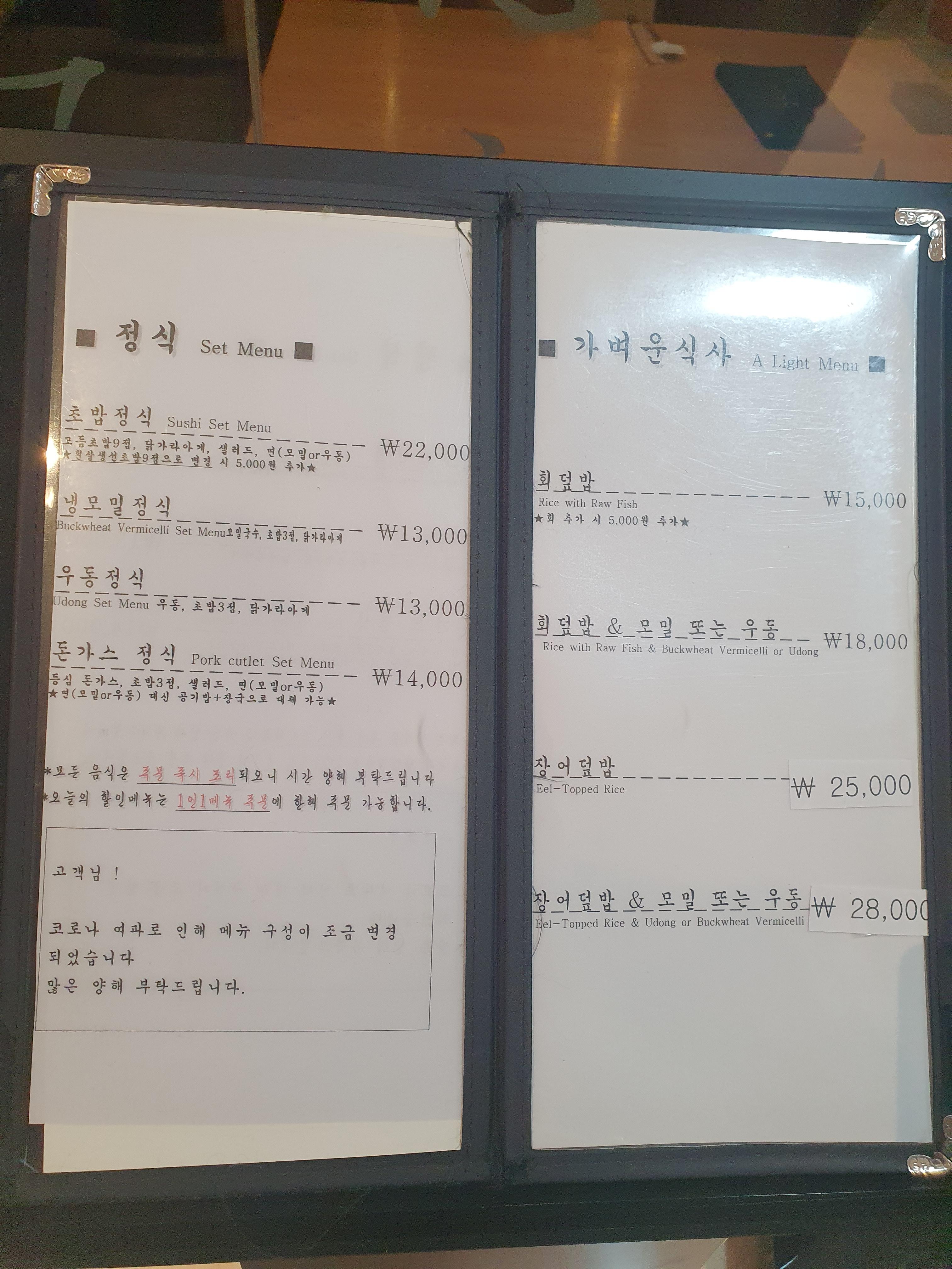 정식메뉴 초밥,우동, 돈가스, 모밀이 있고 이외에도 회덮밥, 장어덮밥등 다양하게 있습니다.ㅊ