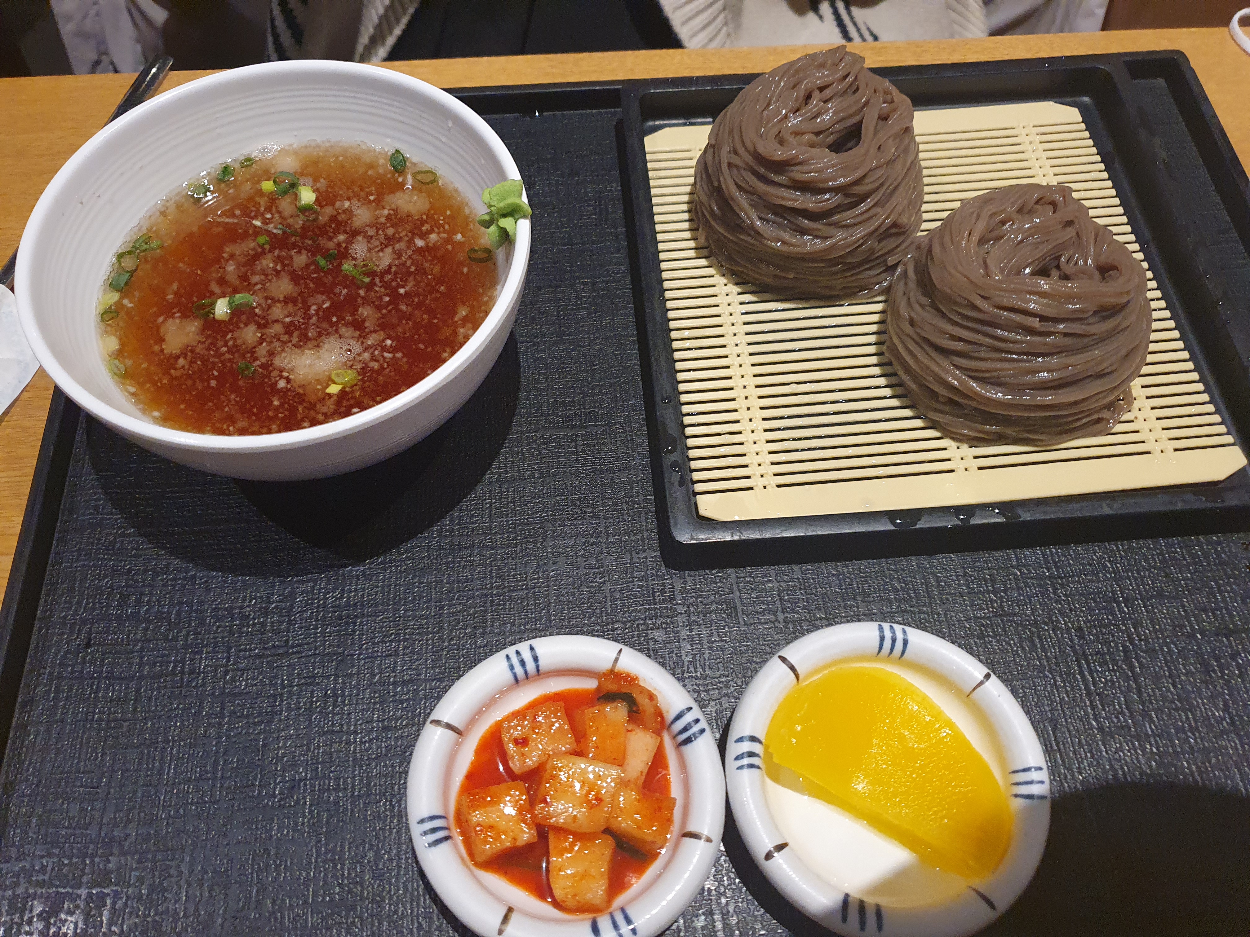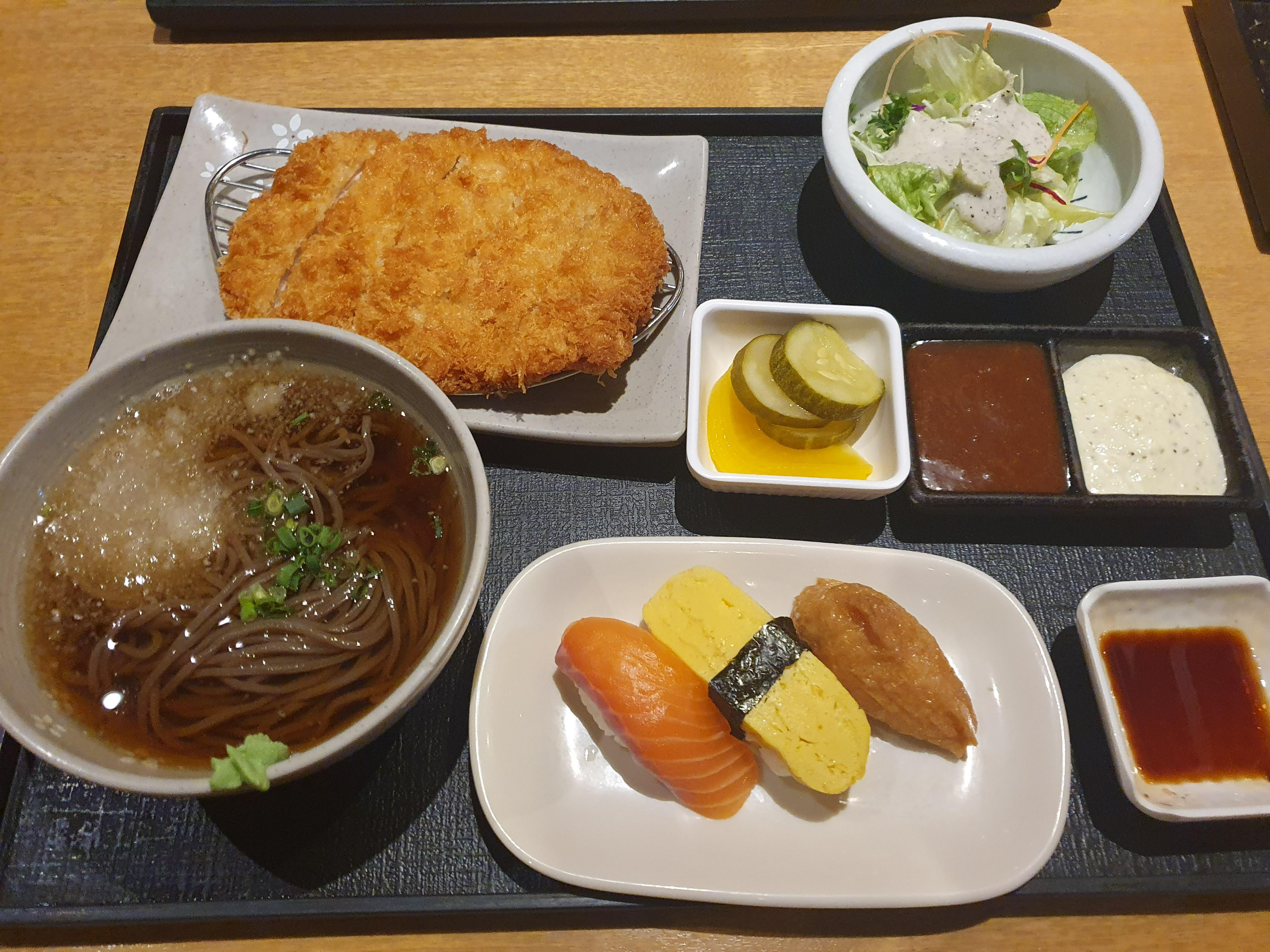 돈가스 정식은 모밀이나 우동 선택이 가능하고, 장국과 밥으로도 가능합니다. 돈가스, 샐러드 초밥3개 모밀 이렇게 나오네요. 돈가스도 모밀도 초밥도 맛이 괜찮은 편이었습니다. 단품 메뉴인 모밀국수는 심플하면서도 모밀을 즐기시기 좋게 나오네요. 매장이 생각보다 크고 지하2층에 푸드에비뉴 보다 사람이 없어서 쾌적하게 느껴졌습니다. 가격이 조금 나가지만 요즘은 모두 가격이 높아져서 푸드에비뉴와 큰 차이는 못느꼈네요.